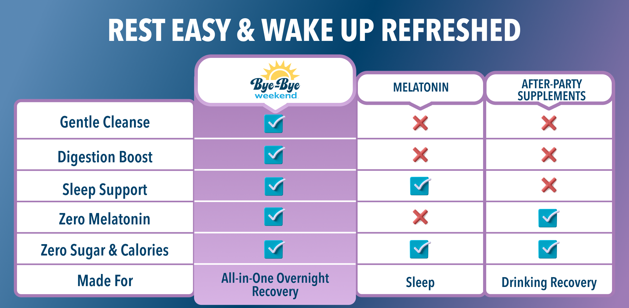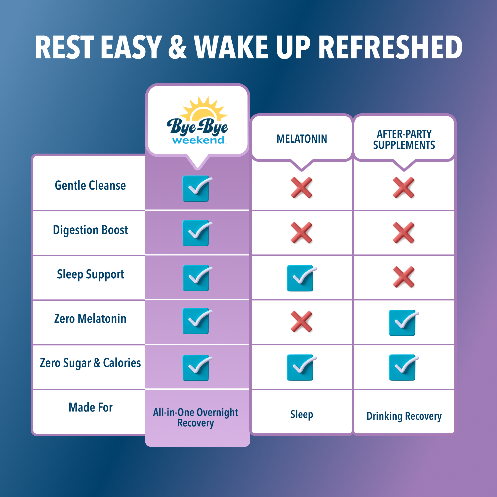 Bye-Bye Weekend PM is specifically designed for nighttime recovery, focusing on cleansing and soothing your body while you sleep. Unlike the original Bye-Bye Weekend, which is made with energy-boosting ingredients, Bye-Bye Weekend PM can help you unwind, relax, and sleep better. To feel your absolute best, we recommend also taking Bye-Bye Weekend the next morning.